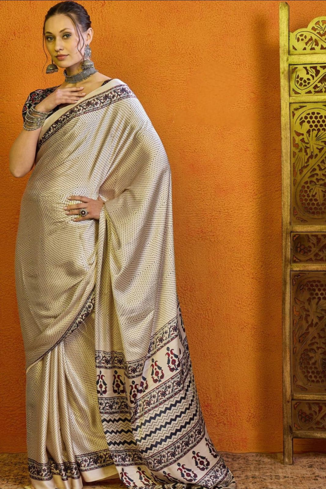 Exclusive Cream Ajrakh Printed Crape Silk Saree