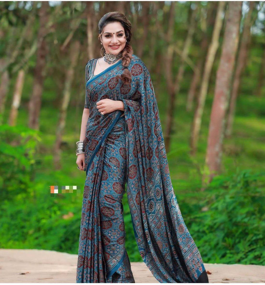 Drape yourself in timeless elegance with our New Ajrakh Satin Crepe Saree, blending traditional art...