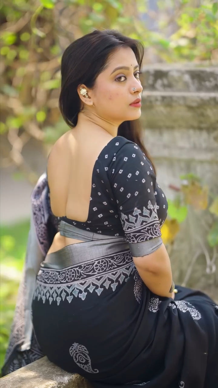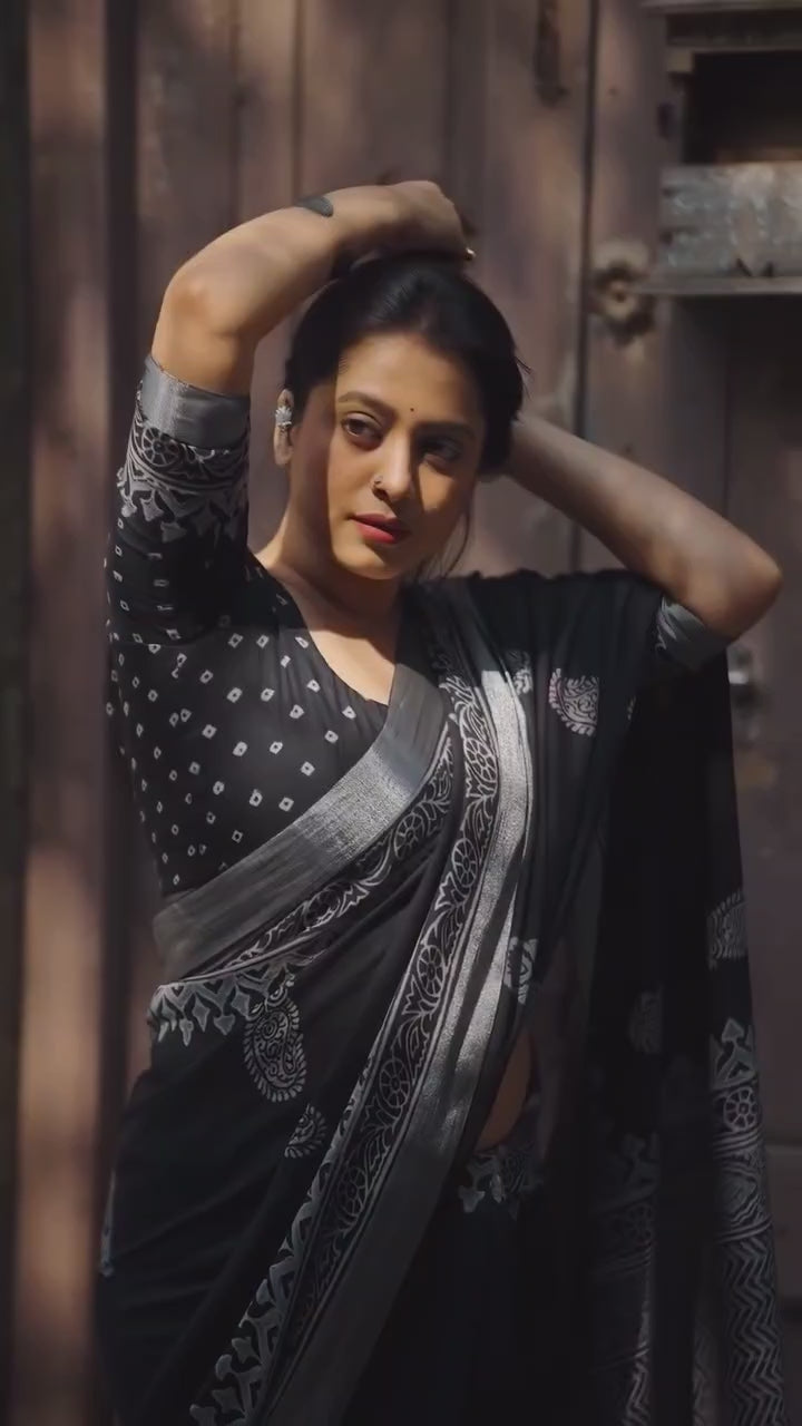 Black Pure Soft Linen Digital Print Saree with Blouse Piece for Women