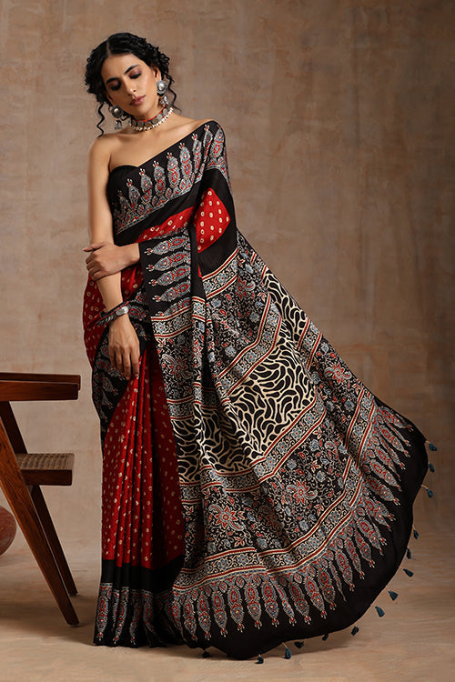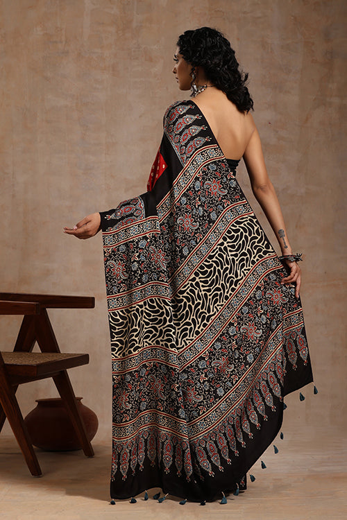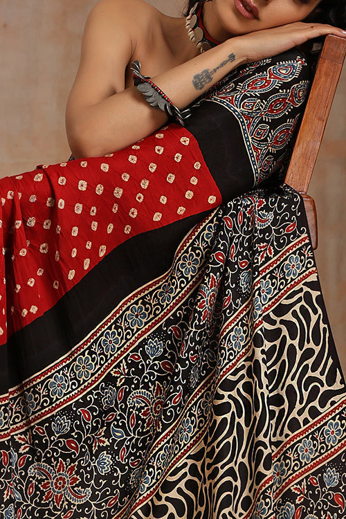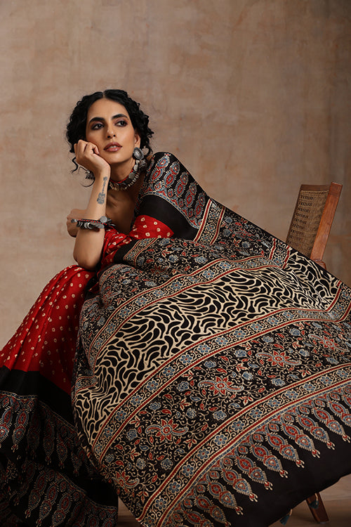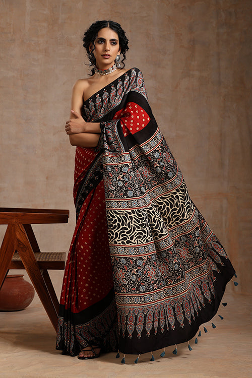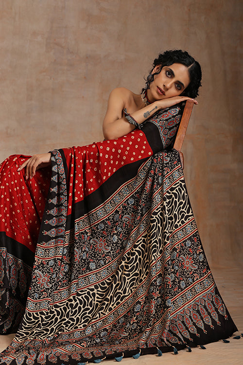 Jahangir Khatri - Black & Red Ajrakh With Bandhani Modal Saree - 00