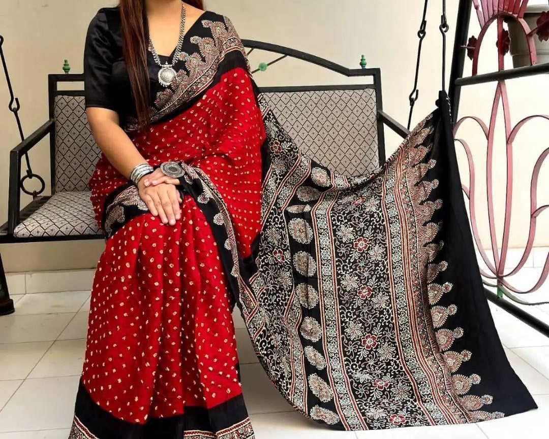 Red Black Ajrakh Digital Print Muslin fabric Saree – Traditional Ethnic Wear for Women